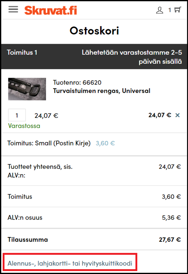 Kun aiot käyttää alennuskoodin tai lahjakortin, lisää tuotteet ostoskoriin tavalliseen tapaan. Kun olet valmis, siirry eteenpäin kassalle ja etsi kohta ""Alennus-, lahjakortti- tai hyvityskuittikoodi"". Syötä koodisi ja paina sen jälkeen "Käytä koodia".
