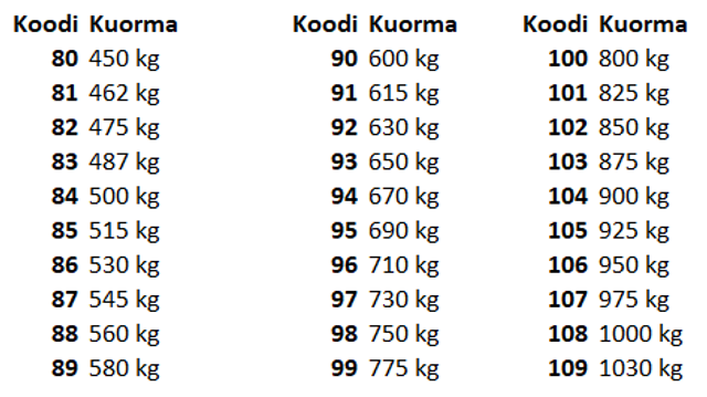 Mitä suurempi numero, sitä enemmän painoa renkaat kestävät. Jos renkaiden kantavuusindeksi on esimerkiksi 94, tämä tarkoittaa, että renkaat kestävät 670 kg. Kokonaiskantavuuskapasiteetti auton alla oleville neljälle renkaalle on silloin neljä kertaa 670 kg eli yhteensä 2680 kg.
