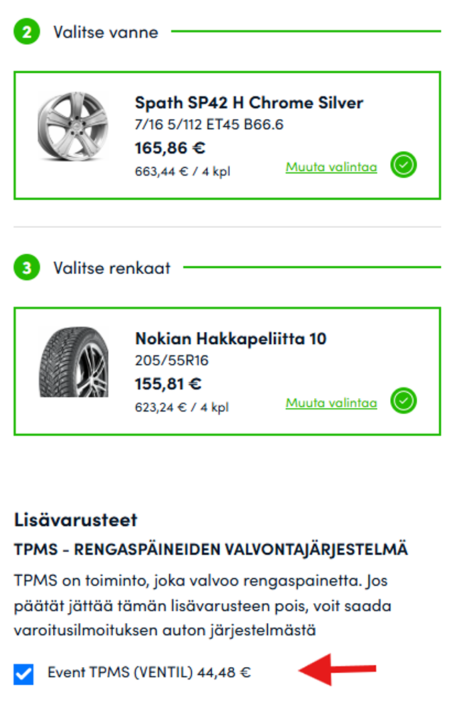 Kun olet hakenut ajoneuvosi rekisterinumerolla, valinnut täydelliset renkaat ja tehnyt vanne- ja rengasvalinnat, siirryt kassalle. Kassalla näkyy lisävarusteiden osio. Valitse vaihtoehto TPMS (venttiili) lisätäksesi sen tilaukseesi.