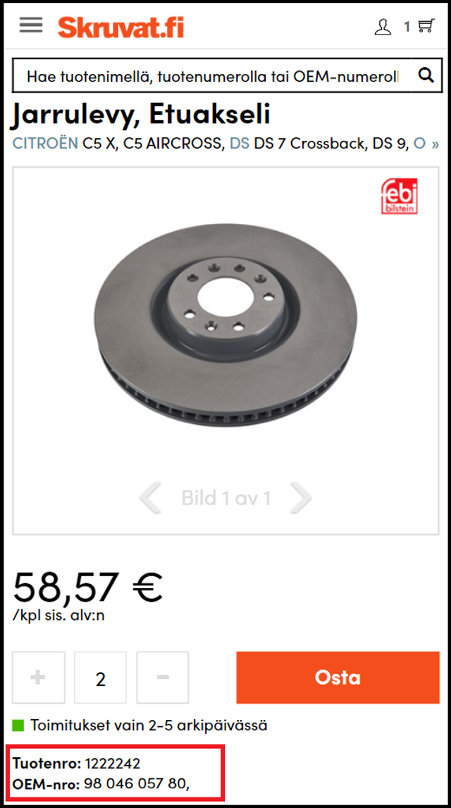 OEM-numero tai autovalmistajien tuotenumero on haettavissa hakukentässämme kotisivun yläreunassa.