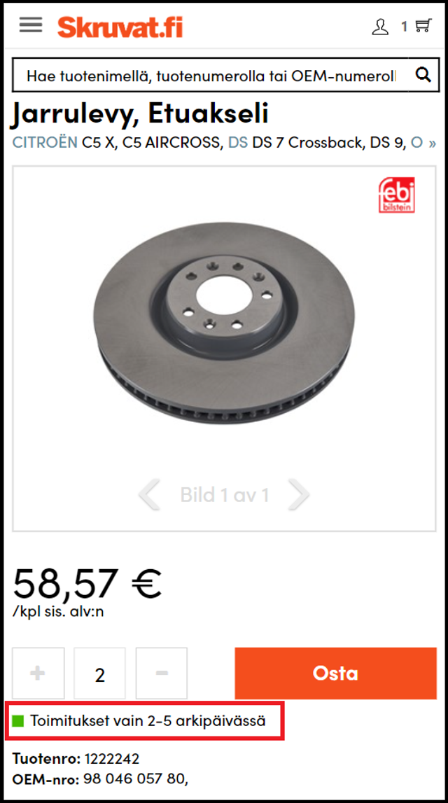 Toimitusaika jokaiselle tuotteelle näkyy sekä tuotesivulla, määrän valinnan yhteydessä, että ostoskorissasi, kun olet viimeistelemässä ostosta.